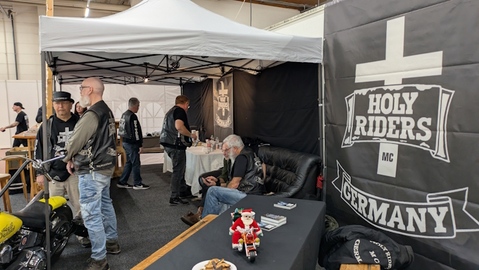 Diesmal platzierten wir uns in der großen Halle 22. Von Freitag bis Sonntag strömten die Menschen an unseren Stand vorbei. Manchen war unsere Präsenz egal. Manche warfen uns einen eher verächtlichen Blick zu, "was wollen DIE denn hier?" Manche kamen jedoch an unser Pavillon. Sie nahmen eine von den Bikerbibeln mit, oder griffen ein Roadbook ab, welche in großer Stückzahl in der Auslage, und in der großen Schatztruhe lagen.